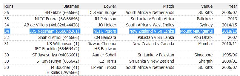 නවසීලන්ත කණ්ඩායම සමඟ පැවැත්වෙන පළමු එක්දින තරඟයේදි එක් පන්දුවාරයකදී වැඩිම ලකුණූ ප්රමාණයක් ලබා දුන් පන්දු යවන්නන් අතර තෙවැනි (සම) ස්ථානයට පත් වෙමීන් වාර්තා පොත් අතර සටහන් විමට ශ්රී ලංකා ක්රීඩක තිසර පෙරේරාට සිදුවිය.
