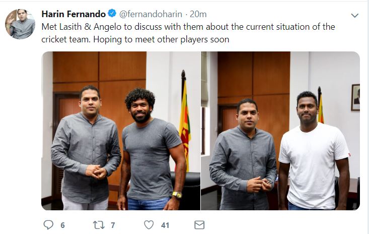 ශ්රී ලංකා කණ්ඩායමේ හිටපු නායක ඇන්ජලෝ මැතිව්ස් සහ වර්තමාන එක්දින හා විස්සයි -20 කණ්ඩායම්හි නාය ලසිත් මාලිංග හා ක්රීඩා අමාත්ය හරීන් ප්රනාන්දු මහතා අතර කතිකාවක් පවත්වා තිබේ.