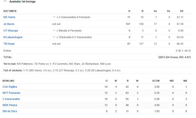 සංචාරක ශ්රී ලංකා කණ්ඩායම සමග කැන්බරාහිදි අද (01) ආරම්භ වු දෙවන ටෙස්ට් තරගය තේ පානය සඳහා අත්හිටුවන විට කාසියේ වාසිය දිනා සිය පළමු ඉනිම ක්රීඩා කරන ඔස්ට්රේලියා කණ්ඩායම කඩුලු 03 ක් දැවි ලකුණූ 220 ක් රැස් කරගෙන සිටියේය.