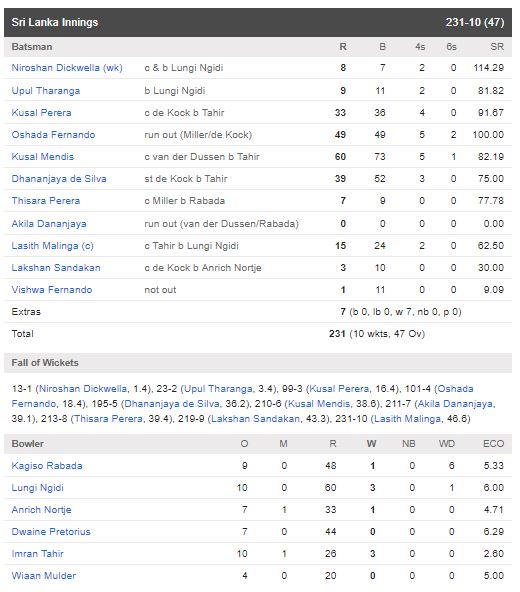 කාසියේ වාසිය දිනු දකුණූ අප්‍රිකා කණ්ඩායමේ ආරාධනයෙන් පළමුව පන්දුවට පහරදුන් ශ්‍රී ලංකා කණ්ඩායම පන්දුවාර 47 කදී ලකුණු 231 කට සීමා විය.