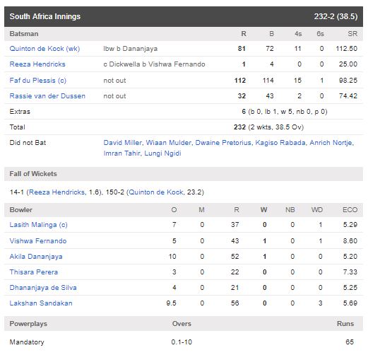 ඒ අනුව පිළිතුරු ඉනිම ක්‍රීඩා කළ දකුණූ අප්‍රිකා කණ්ඩායම පන්දුවාර 38 යි පන්දු 05 කදී කඩුලු 02 ක් පමණක් දැවි සිය ජයග්‍රහාහි ඉලක්කය සපුරා ගත්තේය.