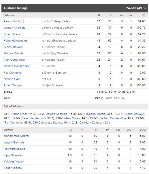පිළිතුරු ඉනිම ක්රීඩා කළ ඔස්ට්රේලියා කණ්ඩායමට පන්දුවාර 49 යි පන්දු 03 කදී සියලු දෙනා දැවි ලබා ගැනිමට හැකි වුයේ ලකුණූ 242 ක් පමණි.