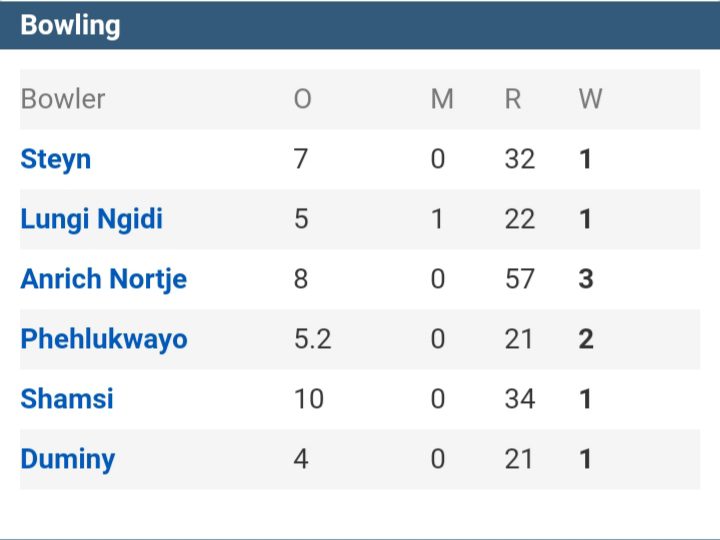ජයග්‍රහණය සඳහා ලකුණු 190 ක ඉලක්කයක් හඹාගිය දකුණු අප්‍රිකානු පිතිකරුවෝ ඕවර 32.5 ක් අවසානයේ කඩුලු 04 ක් පමණක් දැවී එම ඉලක්කය සපුරාගත්හ.