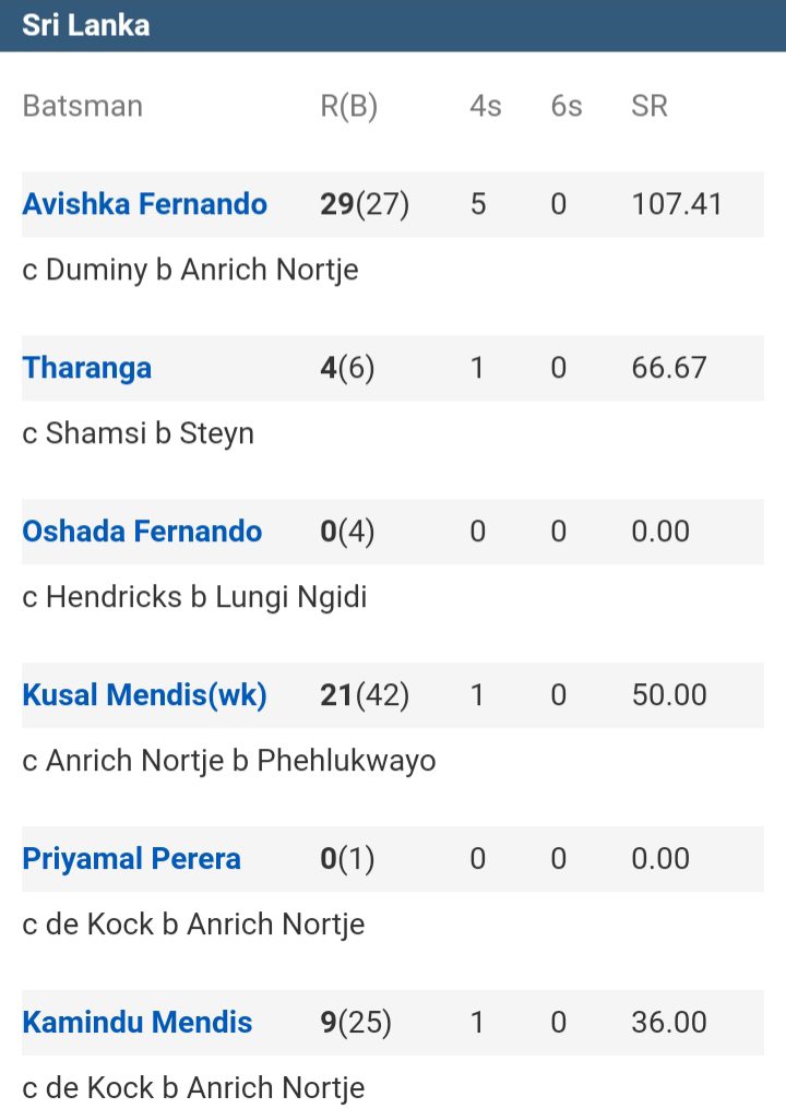 (⁣ෆාස්ට් නිව්ස් – කොළඹ) – සංචාරක ශ්‍රී ලංකා කණ්ඩායම සහ දකුණු අප්‍රිකා කණ්ඩායම අතර අද (13) පොර්ට් එළිසබෙත්හිදී පැවැත්වෙන  සිව්වන එක්දින තරගයේ කාසියේ වාසිය දිනු දකුණු අප්‍රිකා කණ්ඩායමේ ආරාධනය මත පළමුවෙන් පන්දුවට පහරදුන් ශ්‍රී ලංකා කණ්ඩායමට පන්දුවාර 39 යි පන්දු 02 කදි සියලු දෙනා දැවි ලකුණු 189 ක් රැස් කළේය.