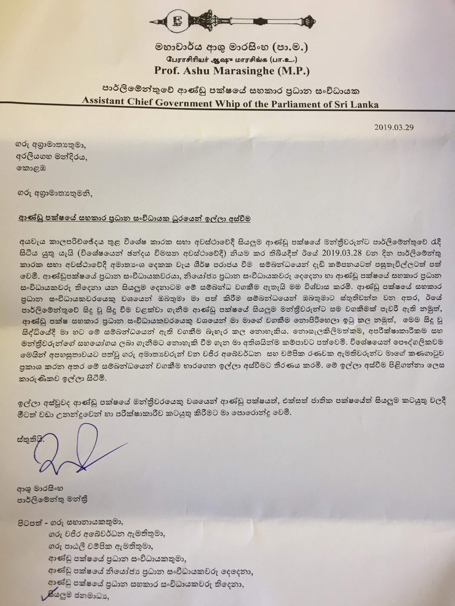 (ෆාස්ට් නිව්ස් – කොළඹ) – එක්සත් ජාතික පෙරමුණූ පාර්ලිමේන්තු මන්ත්රී ආශු මාරසිංහ මහතා ආණ්ඩු පක්ෂයේ ප්රධාක සහකාර සංවිධායක ධූරයෙන් ඉල්ලා අස්විමේ ලිපිය අද (29) අග්රාමාත්ය රනිල් වික්රමසිංහ මහතා වෙත යවා තිබේ.