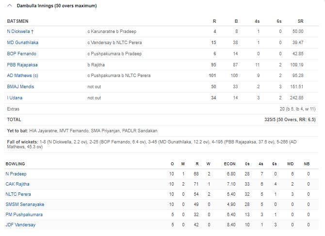 (ෆාස්ට් නිව්ස් – කොළඹ) – ශ්රී ලංකා ක්රිකට් ආයතනය සංවිධානය කරන සුපර් 04 පළාත් එක්දින ක්රිකට් තරගාවලියේ තෙවන ස්ථානය තෝරා ගැනිම සඳහා දඹුල්ල හා මහනුවර කණ්ඩායම අද (10) රංගිරි දඹුලු ක්රීඩාංගණයේදි පැවැත්වෙන තරගයේ පළමුව පන්දුවට පහරදුන් දඹුල්ල කණ්ඩායම පන්දුවාර 50 තුළ කඩුලු 05 ක් දැවි ලකුණූ 325 ක් රැස් කළේය.