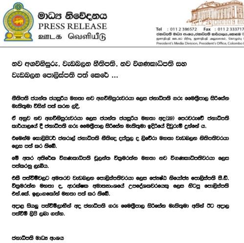 (ෆාස්ට් නිව්ස් – කොළඹ) –  නව අගවිනිසුරු, වැඩබලන නීතිපති,නව විගණකාධිපති සහ වැඩබලන පොලිස්පති පත් කිරිමට ජනාධිපති මෛත්‍රිපාල සිරිසේන මහතා කටයුතු කර ඇති බව ජනාධිපති මාධ්‍ය අංශය නිවේදනයක් නිකුත් කරමීන් සඳහන් කර තිබේ.