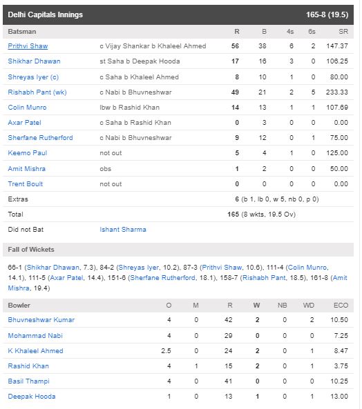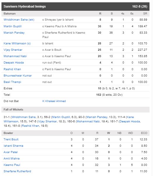 කාසියේ වාසිය දිනාගත් දිල්ලි කණ්ඩායමේ ආරාධනයෙන් පළමුව පන්දුවට පහරදුන් හයිද්‍රාබාද් කණ්ඩායම පන්දුවාර 20 අවසානයේ කඩුලු 08 ක් පමණක් දැවි ලකුණු 162 ක් ලබා ගත්තේය.