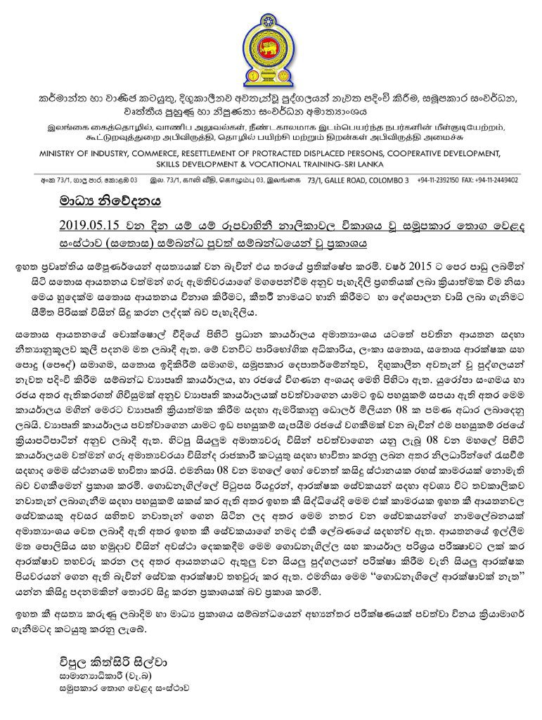 (ෆාස්ට් නිව්ස් – කොළඹ)  – 2019.05.15 වන දින යම් යම් රූපවාහිනී නාලිකාවල විකාශය වූ සමූපකාර තොග වෙළද සංස්ථාව (සතොස) සම්බන්ධ ප්‍රවෘත්තිය සම්පූර්ණයෙන් අසත්‍යයක් වන බැවින් එය තරයේ ප්‍රතික්ෂේප කරන බවට සමුපකාර තොග වෙළද සංස්ථාවේ සාමාන්‍යාධිකාරී (වැ.බ) විපුල කිත්සිරි සිල්වා නිවේදනයක් නිකුත් කරමීන් සඳහන් කර තිබේ.