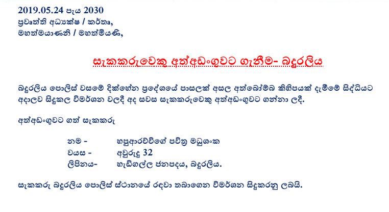 (ෆාස්ට් නිව්ස් – කොළඹ) – බදුරලිය ප්‍රදේශයේ පාසලක අත් බෝම්බ සහිත පාර්සලයක් දමා යාමේ සිද්ධිය සම්බන්ධයෙන්, 32 හැවිරිදි සැකකරුවෙකු අත්අඩංගුවට ගත් බව පොලිස් මාධ්‍ය ප්‍රකාශ කාර්යාලය නිවේදනයක් නිකුත් කරමීන් පවසයි.