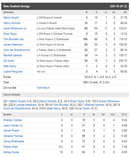 පිළිතුරු ඉනිම ක්‍රීඩා කළ නවසීලන්ත කණ්ඩායමට පන්දුවාර 47 යි පන්දු 02 කදී සියළු දෙනා දැවි රැස් කර ගැනිමට හැකි වුයේ ලකුණූ 330 ක් පමණි.