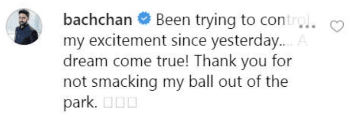 මේ අතර, තෙන්ඩුල්කාර් සමග ක්‍රිකට් ක්‍රීඩාවේ යෙදීම සම්බන්ධයෙන් අදහස් දක්වමින් අභිශේක් සඳහන් කළේ “ඊයේ සිට මගේ උද්වේගය පාලනය කිරීමට උත්සාහ කළා. සිහිනයක් සැබෑ වුණා!” යනුවෙනි.