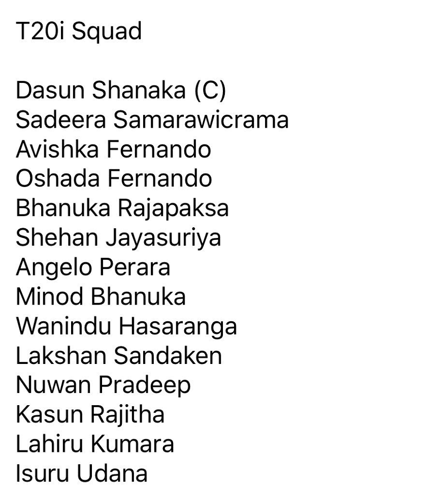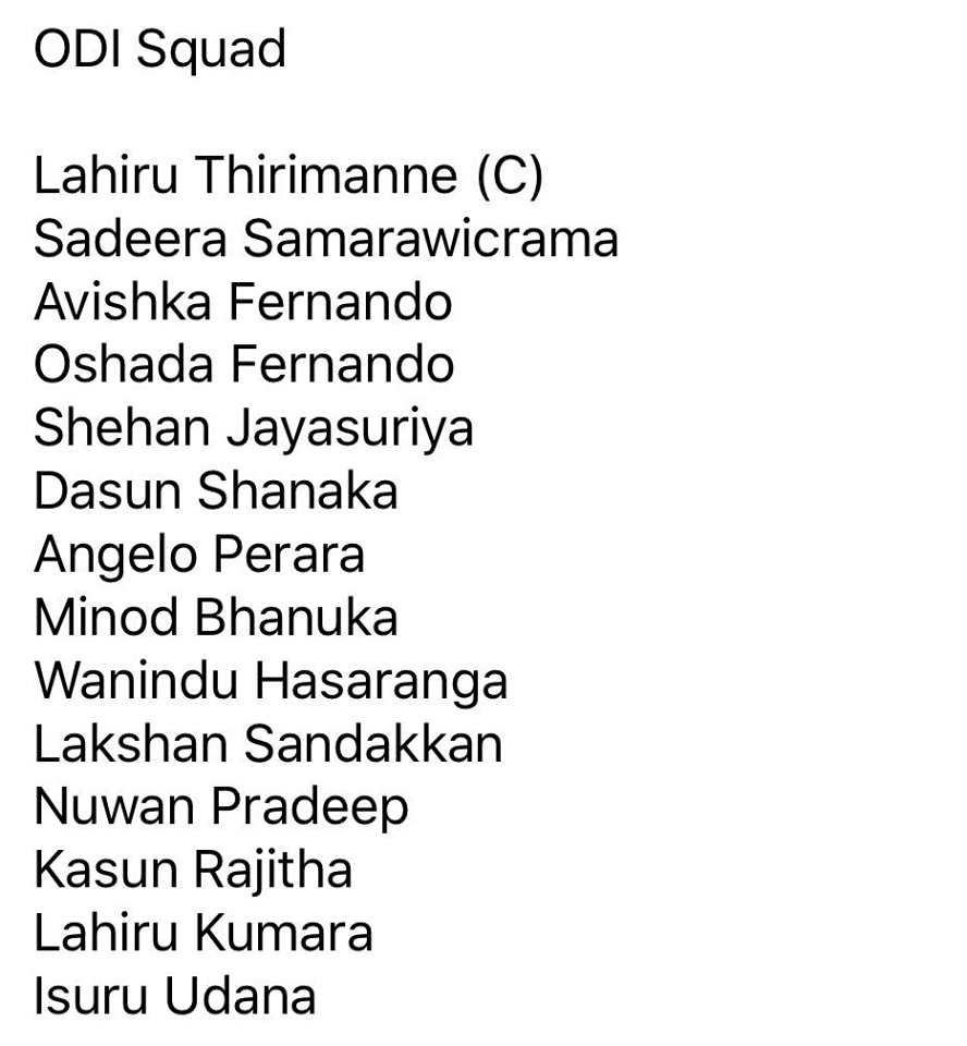 ඒ අනුව ලහිරු තිරිමාන්න ,සදීර සමරවික්රම , අවිශ්ක ප්රනාන්දු , ඕෂද ප්රනාන්දු, ෂෙහාන් ජයසුරිය, දසුන් ශානක, ඇන්ජලෝ පෙරේරා, මිනෝද් භානුක, වනින්දු හසරංග, ලක්ෂාන් සඳකැලුම්, නුවන් ප්රදීප්,, කසුන් රාජිත, ලහිරු කුමාර, ඉසුරු උදාන යන අය එක්දින තරගාවලියේ කණ්ඩායම් සංචිතය සඳහා නම් කර තිබව වාර්තා වේ