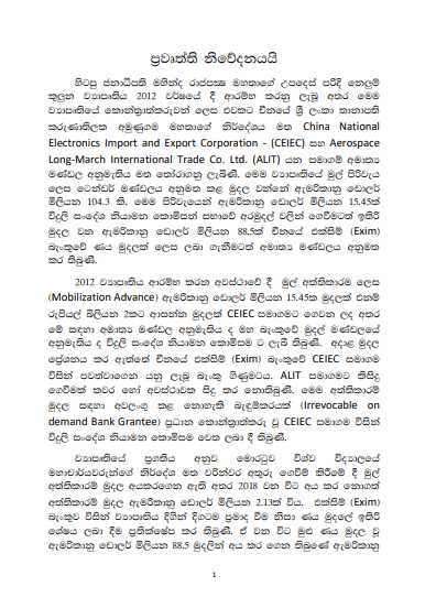 (ෆාස්ට් නිව්ස් | කොළඹ) – කොළඹ නෙළුම් කුළුණ ඉදිකිරීමේ එහි අත්තිකාරම් ලෙස ඇමරිකානු ඩොලර් මිලියන 15.45 ක මුදලක් ඉදිකිරීම් සමාගමට ගෙවීම සම්බන්ධයෙන් චීනයේ Exim බැංකුව විසින් නිකුත් කරන ලද ලේඛණයක් එවකට විදුලි සංදේශ නියාමන කොමිෂන් සභාවේ හිටපු අධ්යක්ෂ ජනරාල් අනූෂ පැල්පිට විසින් ප්රසිද්ධියට පත්කර තිබේ.