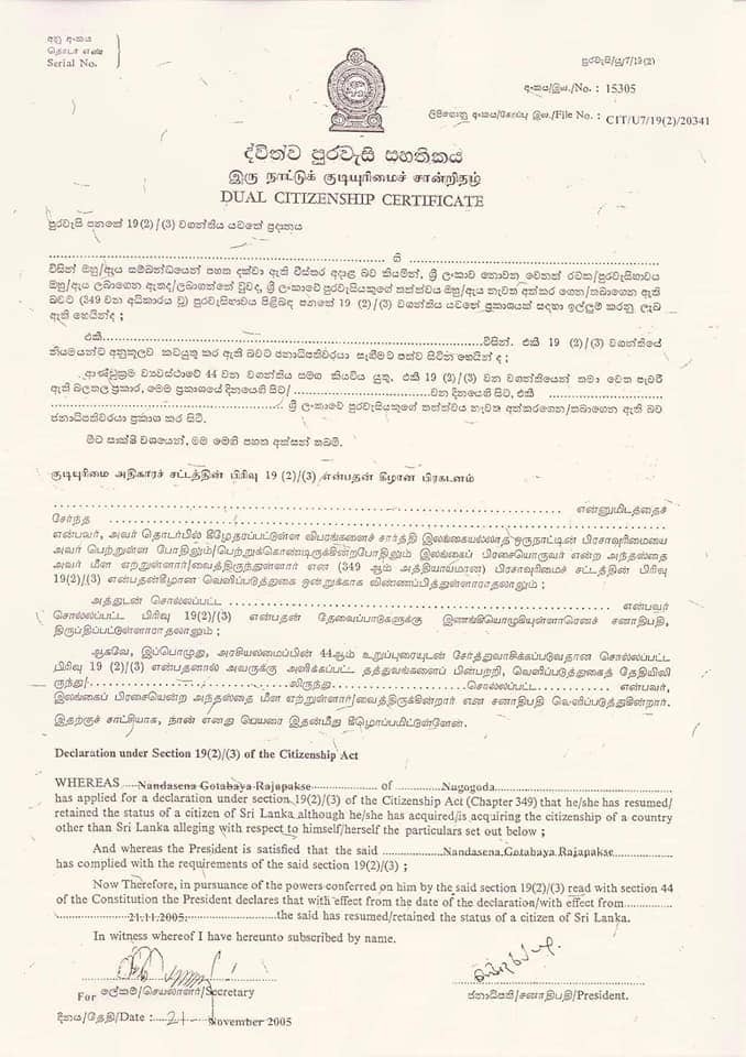 මෙරට විදේශ ගමන් බලපත්‍රයත්, හැදුනුම්පතත් ඔහුට ලැබී ඇත්තේ දැනට පවතින රජය යටතේ බව ඔහු වැඩිදුරටත් පැවසුවේය.
