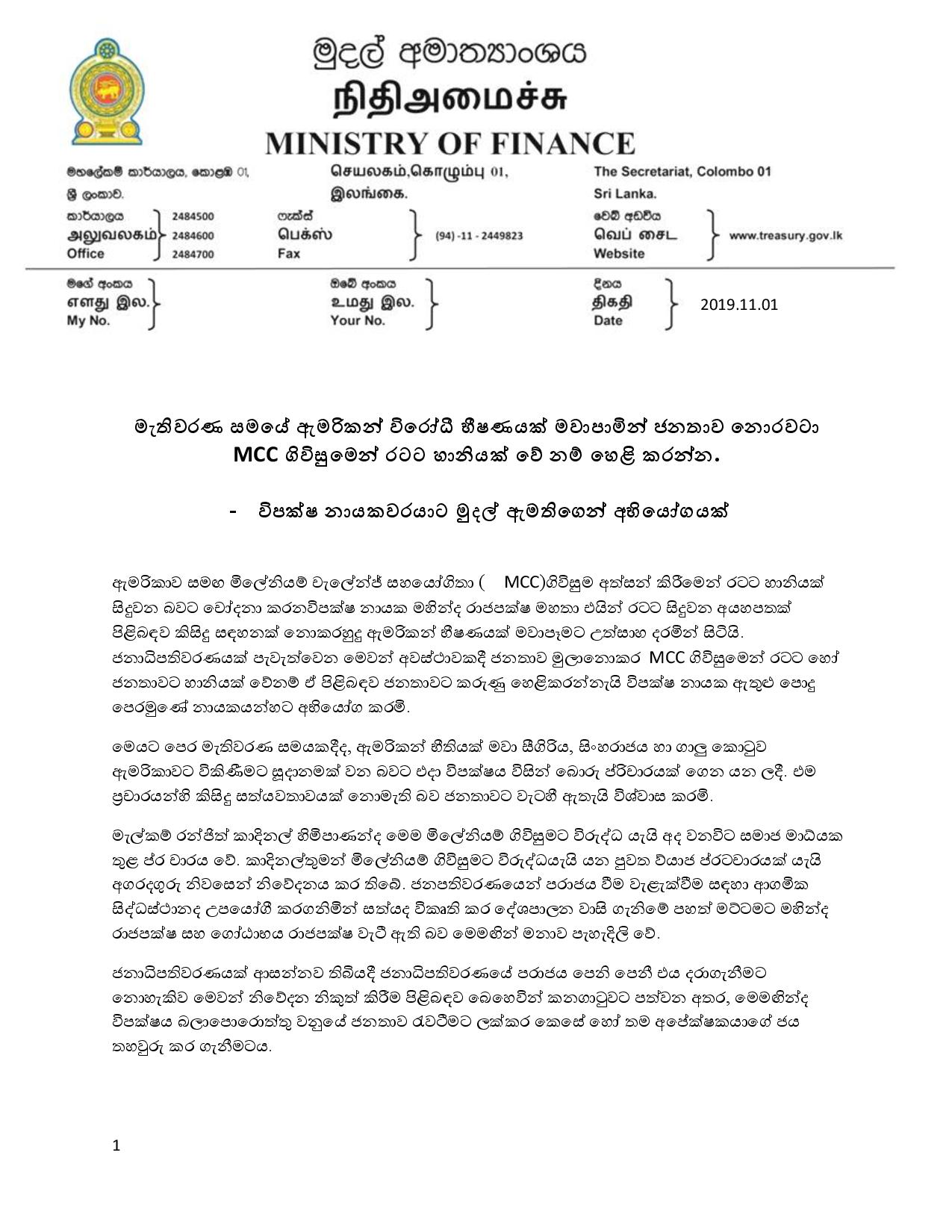 නිවේදනයක් නිකුත් කරමින් අමාත්යවරයා පවසා ඇත්තේ මැතිවරණ සමයේ ඇමරිකන් විරෝධී භීතියක් මවා පාමින් ජනතාව නොරවටා ඉන් රටට හානියක්වේ සිදුවේ නම් වහා එය හෙළි කරන ලෙසයි.