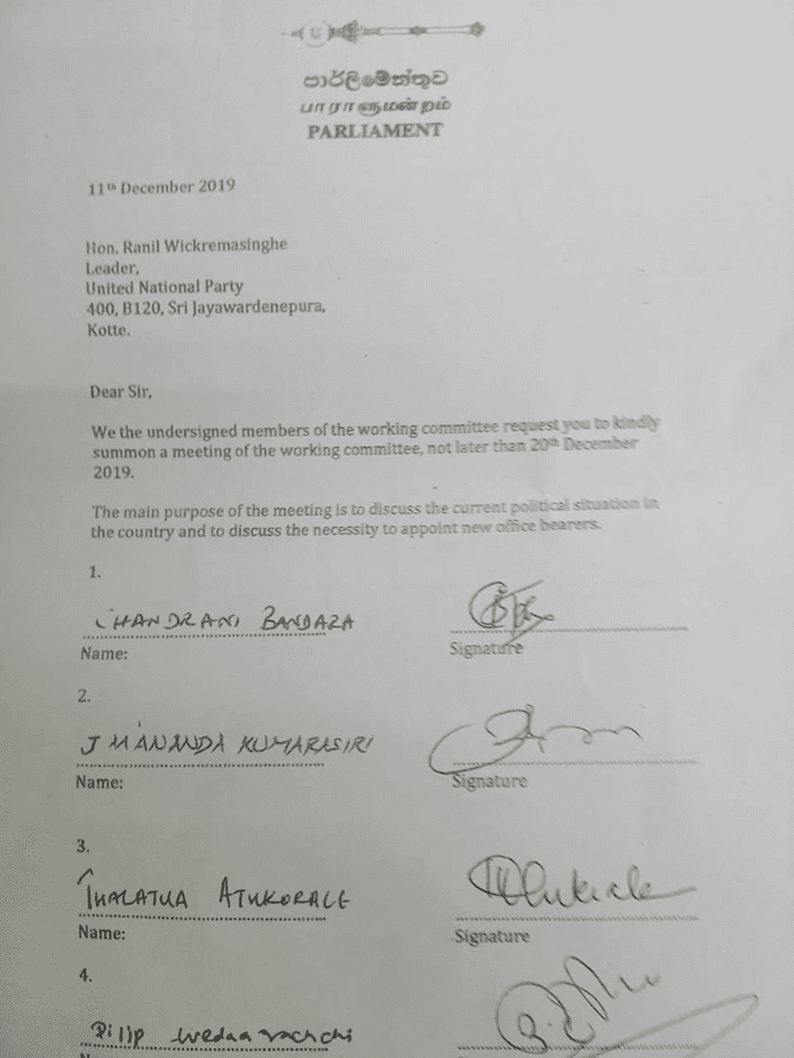 මන්ත්රී අත්සනින් යුතු විශේෂ ලිපියක් රනිල් වෙත [LETTER]