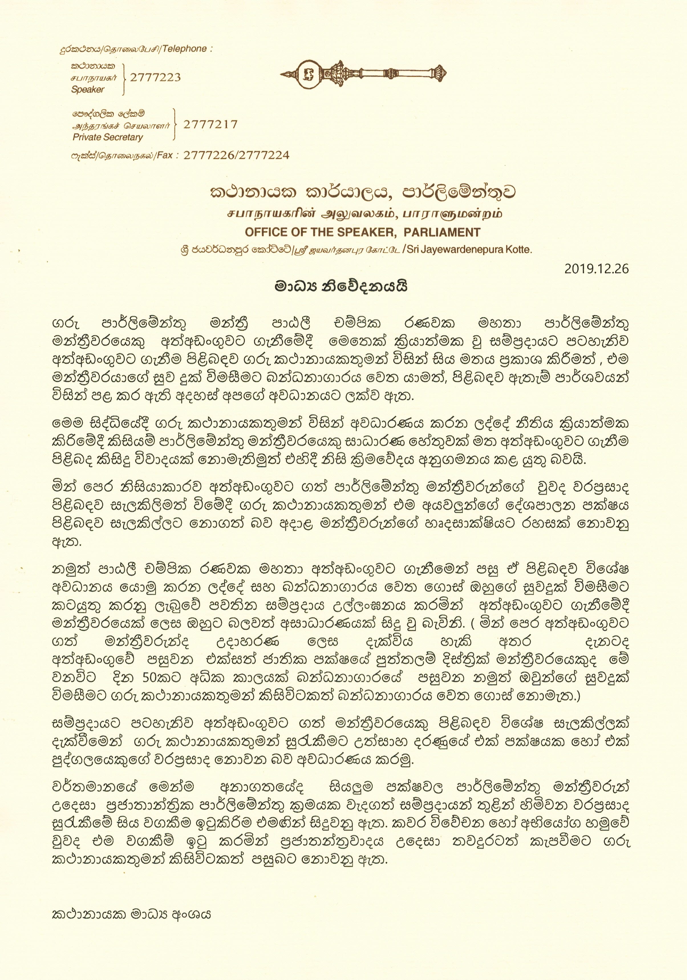 කතානායක කාර්යාලයෙන් නිවේදනයක් [PRESS RELEAS]
