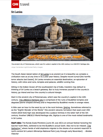 එම වෙබ් අඩවිය සඳහන් කර ඇත්තේ ශ්‍රී ලංකාවේ සංචාරය කරන අයට මහනුවර ඇසළ පෙරහර, මින්නේරිය ජාතික වනෝද්‍යානය පොලොන්නරුව, සීගිරිය සහ ශ්‍රී ලංකාවේ මුහුදු තීරයද නැරඹීමට අමතක නොකරන ලෙසයි.