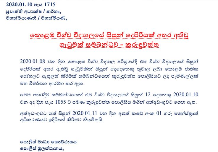 ඒ සිසුන් දෙපිරිසක් අතර හටගත් ගැටුමකින් සිසුන් දෙදෙනෙකු තුවාල ලැබීමේ සිද්ධියකට අදාළවය.