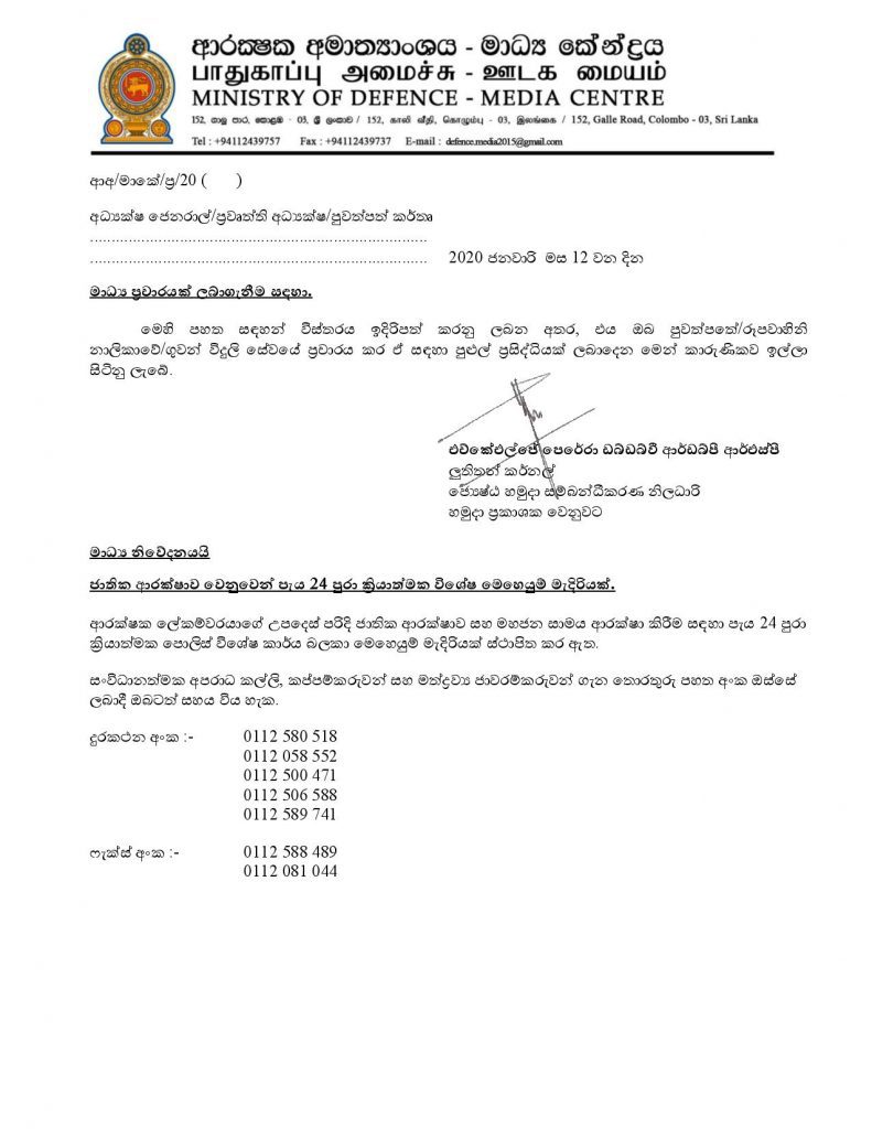 (ෆාස්ට් නිව්ස් | කොළඹ) – ජාතික ආරක්ෂාව වෙනුවෙන් පැය 24 පුරා ක්රියාත්මක පොලිස් විශේෂ කාර්ය බලකා මෙහෙයුම් මැදිරියක් ස්ථාපිත කර තිබෙනවා.