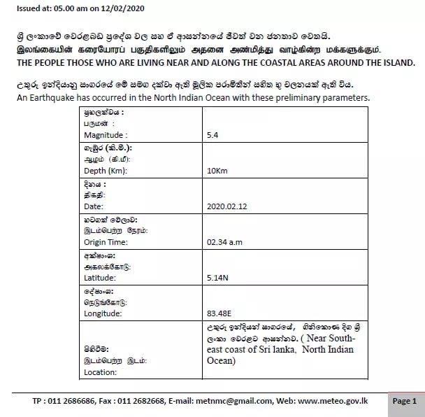 අලුයම 2.34ට රික්ටර් මාපකයේ 5.4ක අගයක් ගත් භූ කම්පනයක් උතුරුදිග ඉන්දියානු සාගර කලාපයේ ඇති වූ බව එහි මාධ්ය අංශයේ සහකාර අධ්යක්ෂ ජානක හඳුන්පතිරාජ කියා සිටියේය.