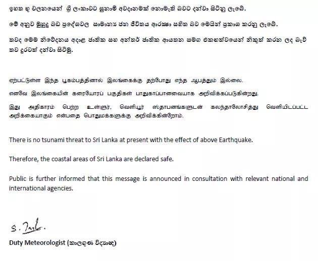 මෙම භූ කම්පන තත්ත්වය යම්තාක් දුරට කොළඹ , ගාල්ල සහ මාතර ප්රදේශවලට දැනී ඇති බව වාර්තා වන බව ද ඔහු සඳහන් කළේය.