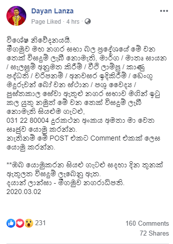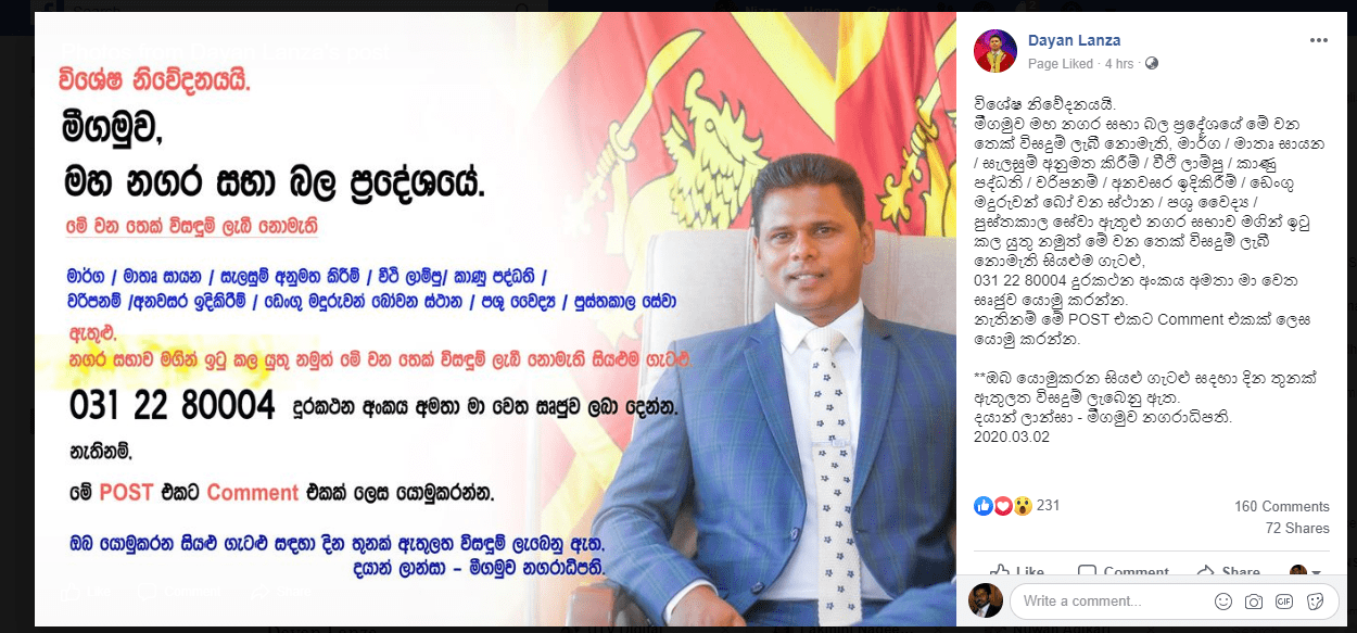 එය අනාගතය වෙනුවෙන් යහපත් ඉඟියකි . එම පැතූ වෙනස අරඹමින් මීගමුව මහ නගර සභාවේ දේශපාලන අධිකාරිය වන නගරාධිපතිවරයා විසින් මහ නගර සභා බල ප්රදේශය තුල මෙතෙක් ජනතාව වෙනුවෙන් ඉටු නොවූ මා ර්ග / මාතෘ සායන /සැලසුම් අනුමත කිරීම / වීදි ලාම්පු /කාණු පද්ධති/අනවසර ඉදිකිරීම්/ඩෙංගු මදුරුවන් බෝවන ස්ථාන/පශු වෛද්ය මහජන ගැටලු ගැටළු සඳහා .. එම ගැටලු කඩිනමින් විසඳීම වෙනුවෙන් යාන්ත්රණයක් සකස් කරමින් එම සියළු අඩුපාඩු තමන් වෙත සෘජුව ජනතාවට දන්වා සිටීමට අවකාශය නිර්මාණය කරමින් .