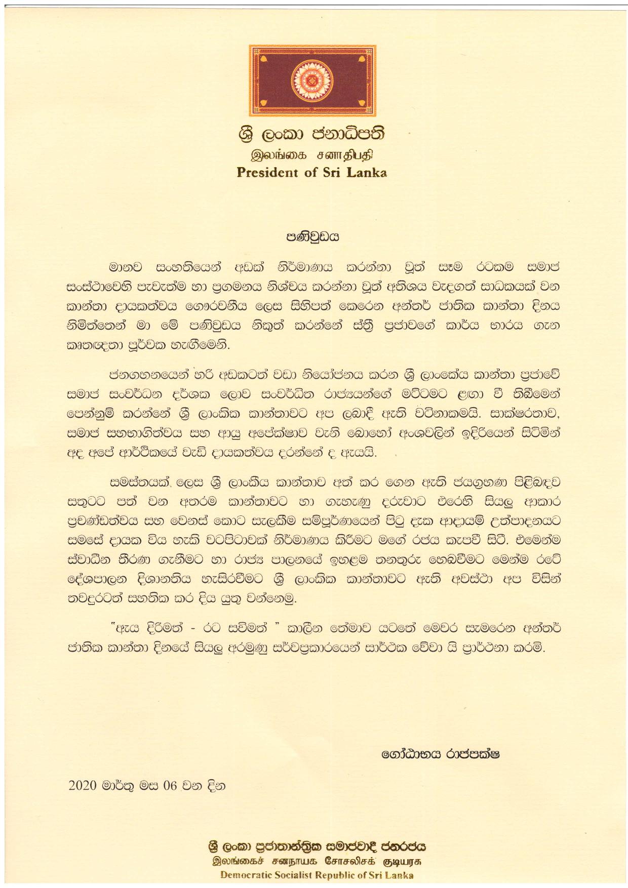 මිට අමතරව, ජගත් කාන්තා දිනය වෙනුවෙන් නිවේදනයක් නිකුත් කරමින් ජනාධිපති ගෝඨාභය රාජපක්ෂ මහතා සඳහන් කළේ සමස්තයක් ලෙස ශ්රී ලාංකීය කාන්තාව අත්කරගෙන ඇති ජයග්රහණ පිළිබඳව සතුටට පත්වන බවයි.