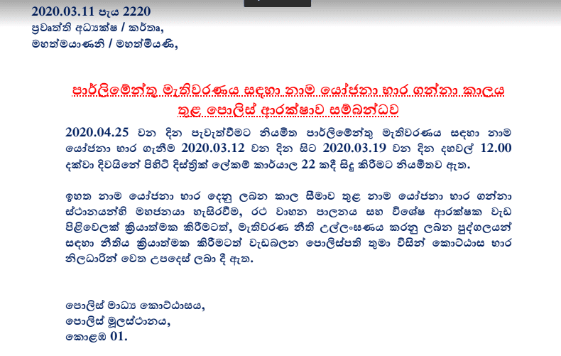 පොලිස් මාධ්ය කොට්ඨාසය විසින් එම නාම යෝජනා බර ගන්නා ස්ථානයන් හි මහජනයා හැසිරවීමට , රථ වාහන පාලනයට විශේෂ ආරක්ෂක වැඩසටහනක් ක්රියාත්මක කර ඇතැයි නිවේදනයක් නිකුත් කරමින් පවසයි.