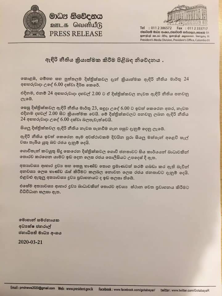 (ෆාස්ට් නිව්ස් | කොළඹ) – කොළඹ, ගම්පහ සහ පුත්තලම දිස්ත්‍රික්කවල දැන් ක්‍රියාත්මක ඇඳිරි නීතිය මාර්තු 24 අඟහරුවාදා උදේ 6.00 දක්වා දීර්ඝ කර තිබේ.