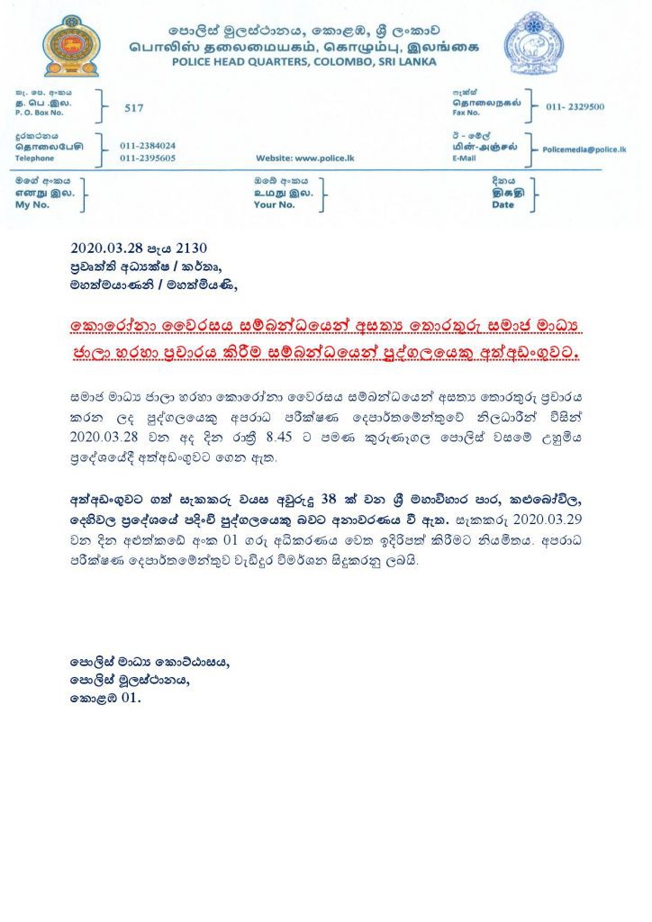 (ෆාස්ට් නිව්ස් | කොළඹ) – කුරුණෑගල උහුමීය ප්රදේශයේදී කොරෝනා වෛරසය පිලිබඳ සමාජ මාධ්ය ඔස්සේ අසත්ය ප්රචාර සිදුකල පුද්ගලයෙකු අත්අඩංගුවට ගෙන තිබේ.