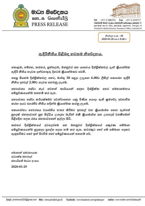 බස්නාහිර පළාත සහ යාපනය දිස්ත්‍රික්කයට පැනවූ ඇඳිරි නීතිය නැවත දැනුම්දෙන තුරු ක්‍රියාත්මක කෙරේ.