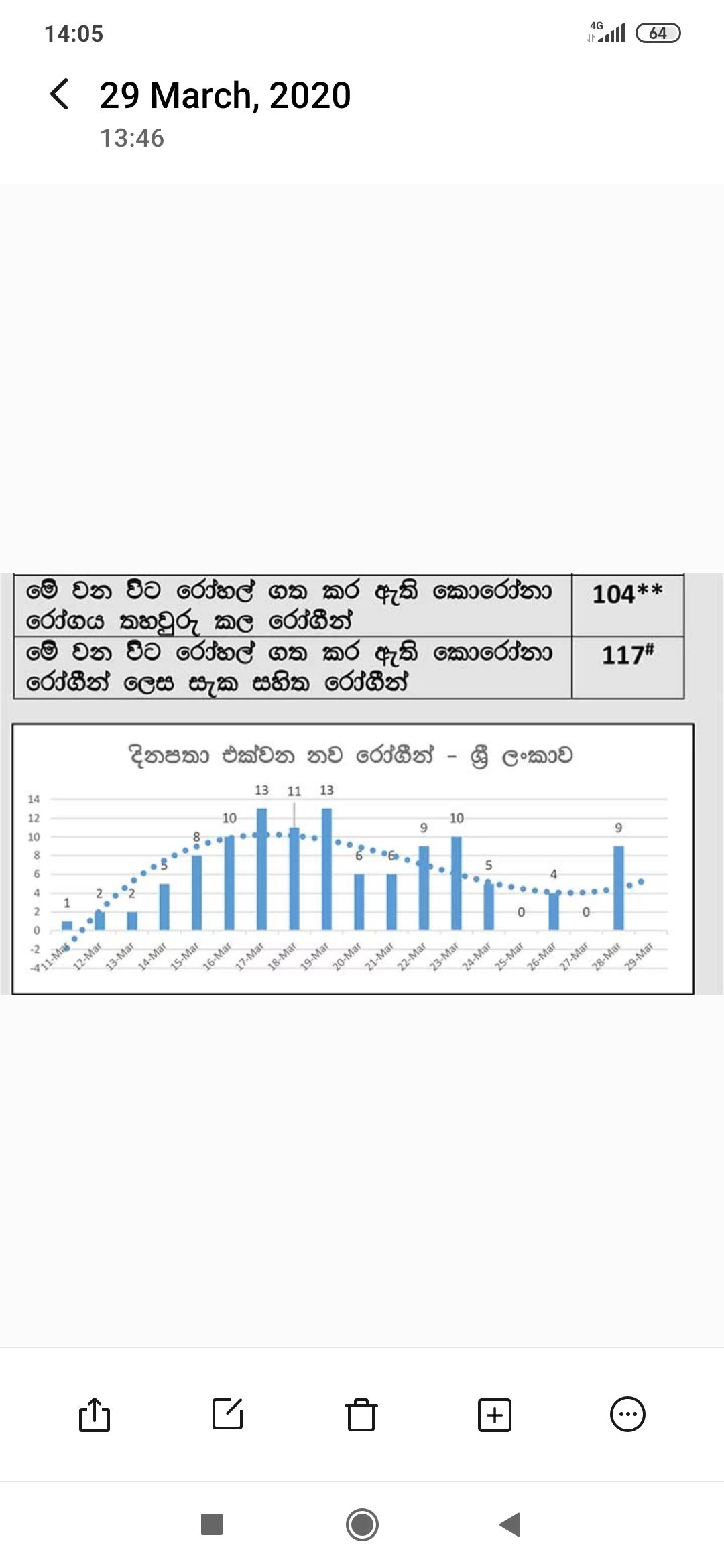අද වන විට කොරෝනා රෝගීන් 104 දෙනෙකු රෝහල්ගතව ප්රතිකාර ලබන අතර 09 දෙනකු සුවපත් වී රෝහලෙන් බැහැරව ගොස් ඇත.