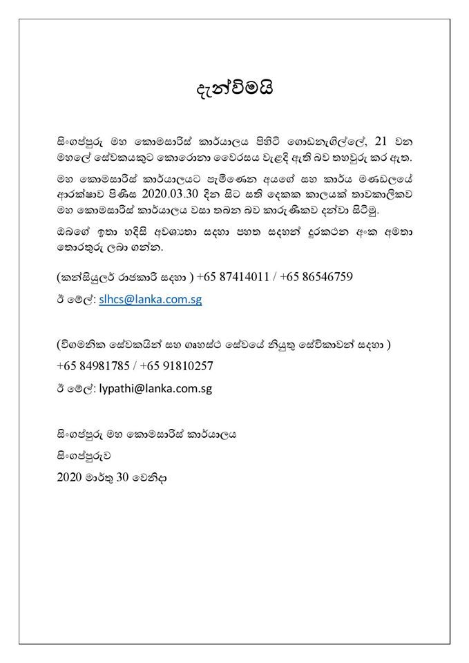 (ෆාස්ට් නිව්ස් | කොළඹ) – අද (30) සිට සති දෙකක කාලයක් සිංගප්පුරුවේ ශ්රී ලංකා මහ කොමසාරිස් කාර්යාලය වසා දමා තිබේ.