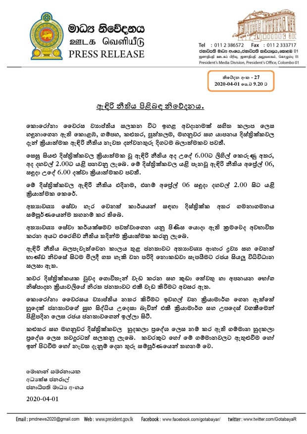 මේ දිස්ත්රික්කවල යළි පැනවූ ඇඳිරි නීතිය අප්රේල් 06, සඳුදා උදේ 6.00 දක්වා ක්රියාත්මක වන අතර එදිනම දහවල් 2.00 සිට ඇඳිරි නීතිය යළි ක්රියාත්මක කරයි.